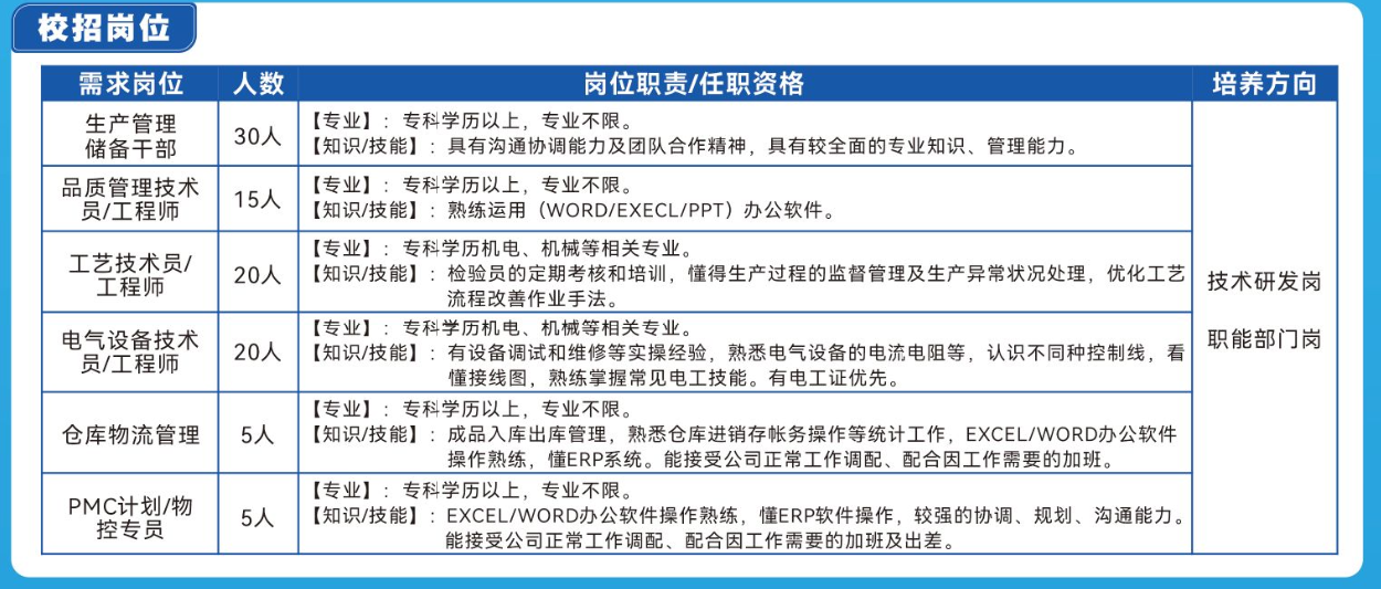 本期招聘岗位推荐:主要面向材料工程技术,新能源汽车技术或其他工科专业